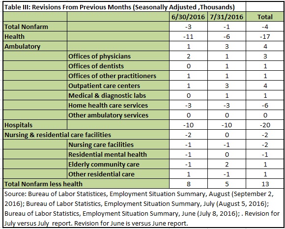 Revisions to the previous months’ estimates were small overall. However, this disguises downward revision to the original June and July estimates of health services jobs and upward revisions to the estimates of non-health jobs (Table III).